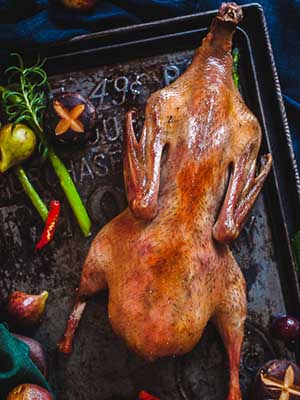 食材:嫩鴨1只(重約2000克)、爆烤鴨香膏、 花椒40粒,八角3只,蔥白50克,老姜30克,料酒50克,精鹽150克,醬油及味精各少許,蜂蜜適量。