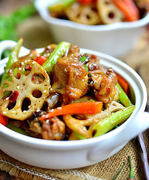 8、倒入炸好的雞塊,藕片,加料酒,生抽,白砂糖一起翻炒。
