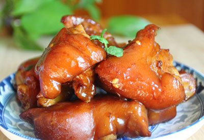 3、倒入豬蹄,繼續(xù)小火慢慢翻炒。
