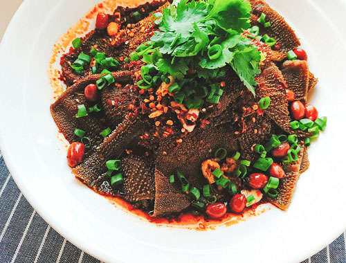 6、調好的汁水淋在擺好的毛肚上,均勻的撒上油酥花生、蔥花、香菜擺中間。